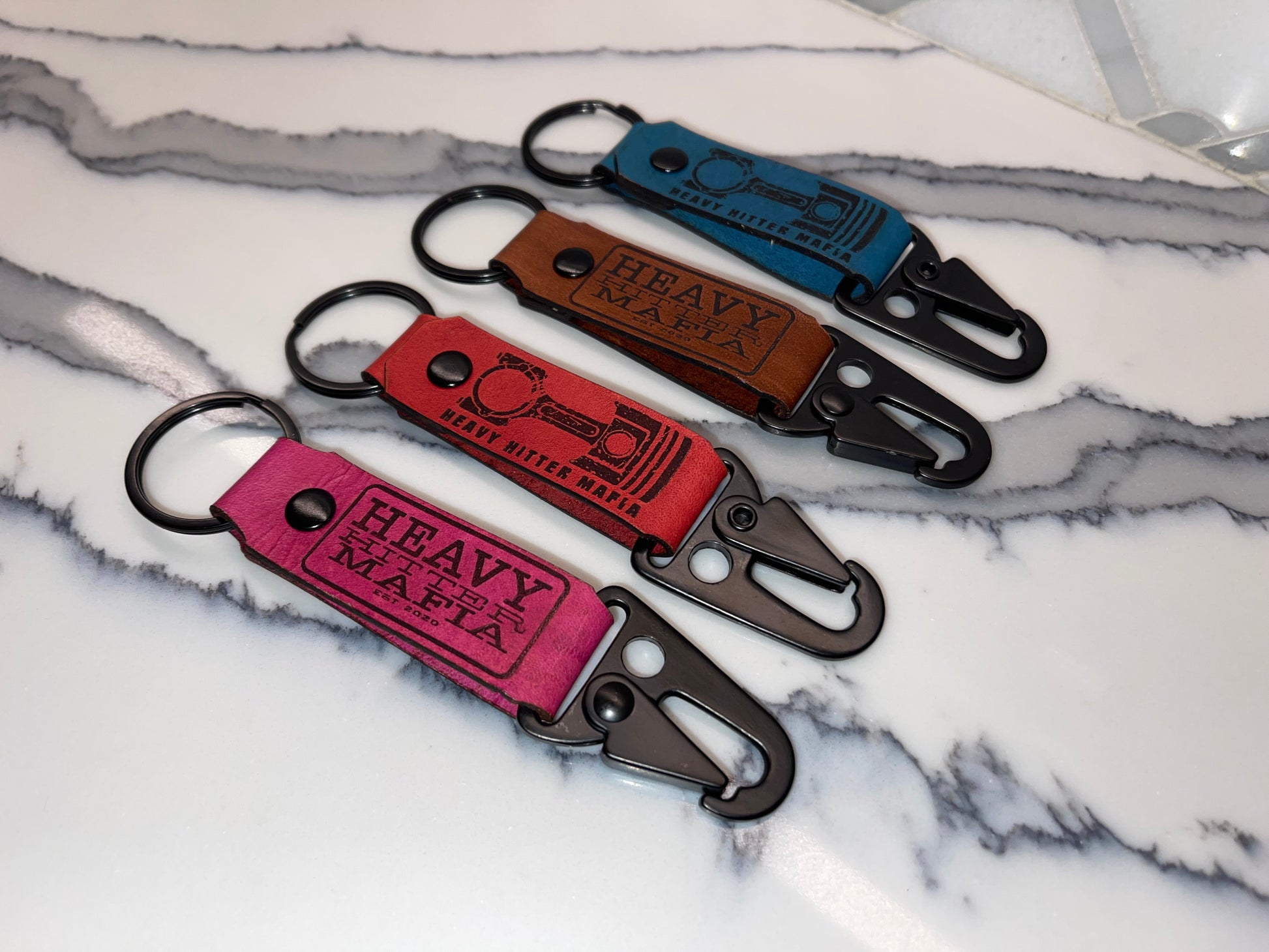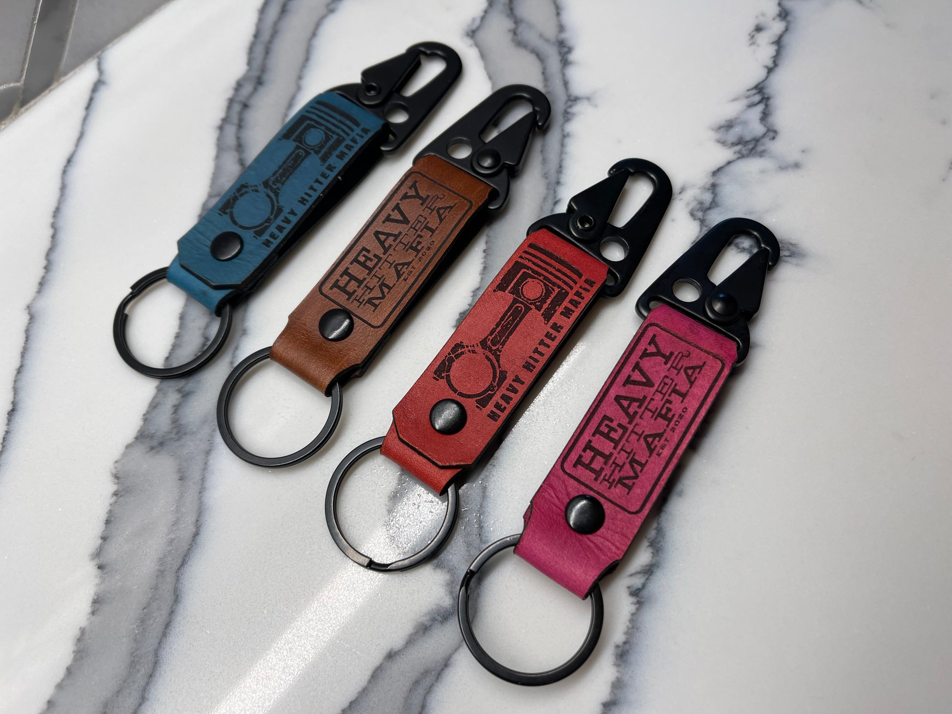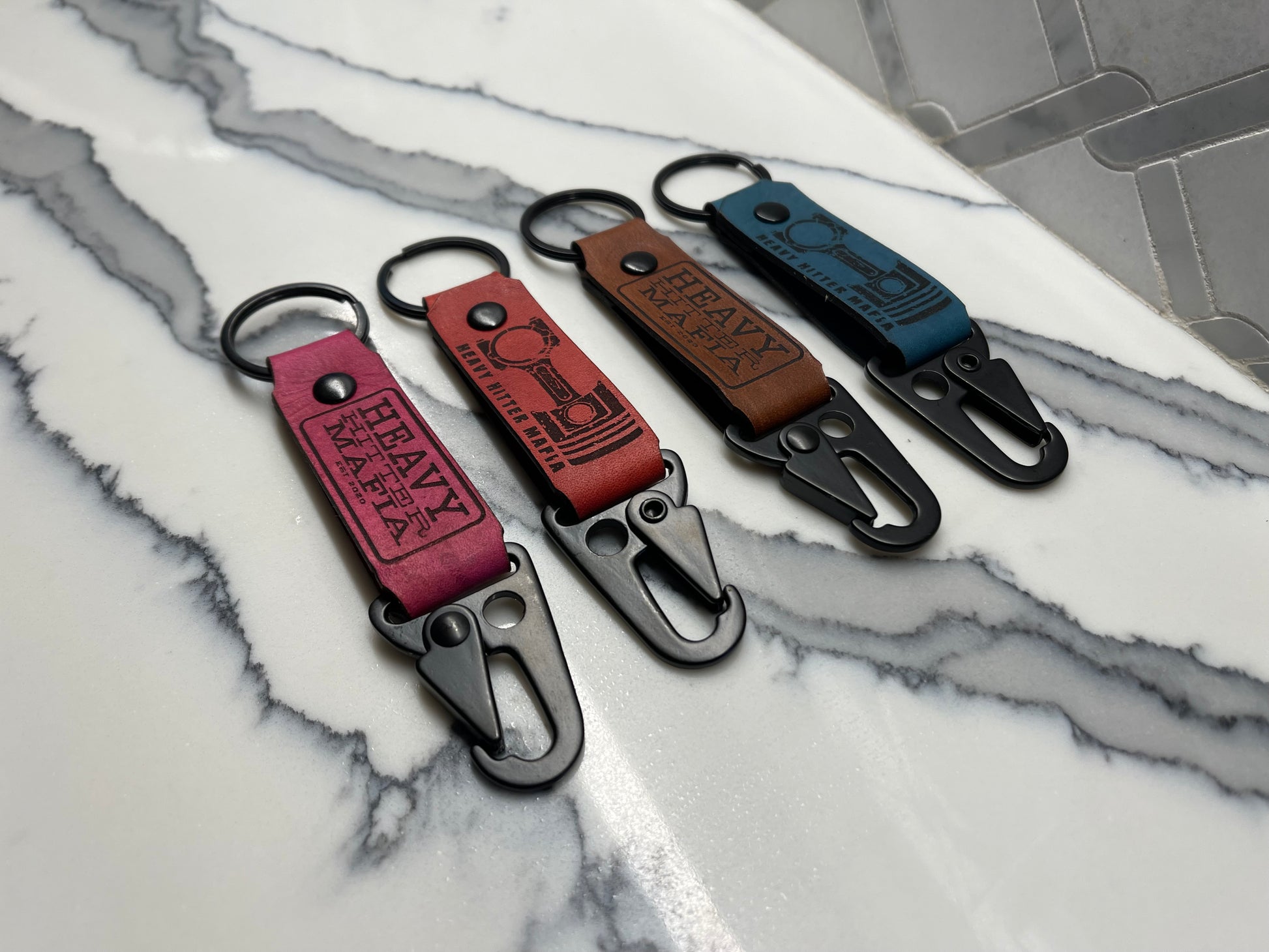 We are now offering these quality hand made leather keychains for a limited time! Our legendary patch design is on one side and our piston logo is on the reverse side. At one end there is a key ring to fit all of your everyday keys. On the other side there is a strong clasp that can easily be clipped onto your belt loop for a secure place to store your keys.