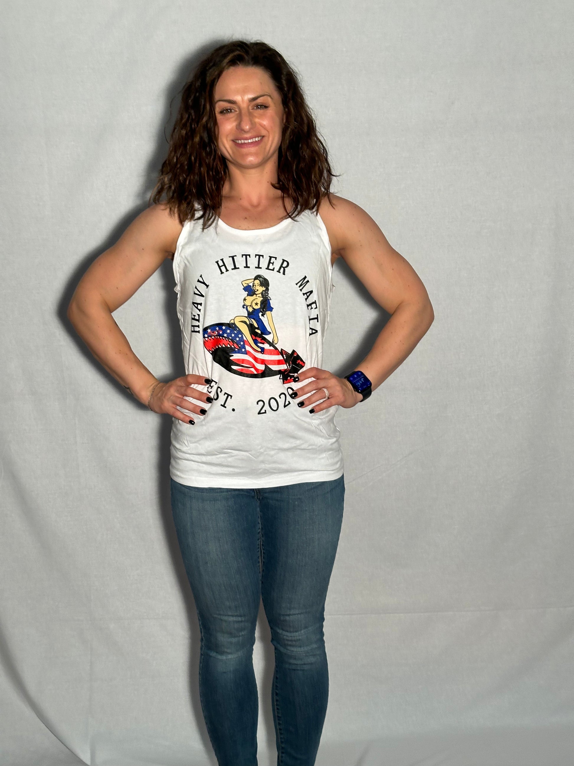 We had to bring this original design back! The original pin up riding on the pride b%mb was a favorite and sold out quick! The tank top is great for girls and guys on those hot summer days! Show your American pride with this tank top.