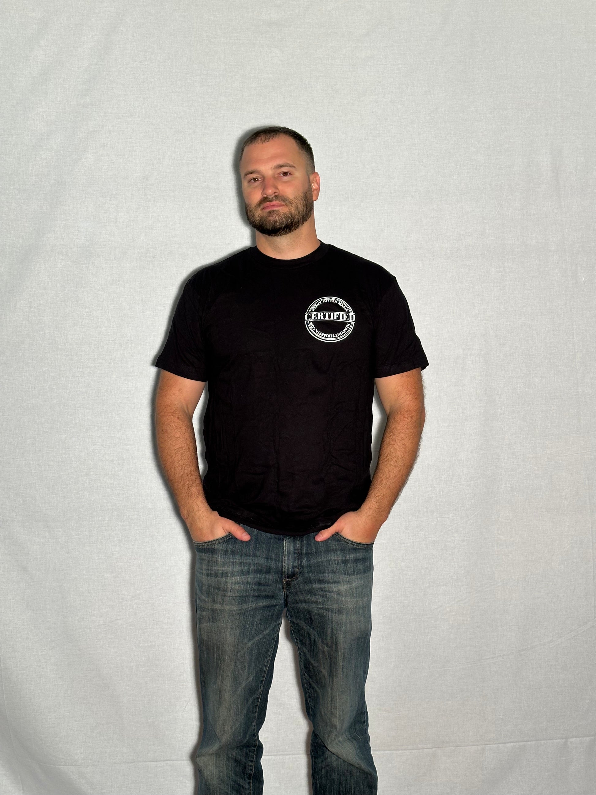 Joe is 5ft 8in 185lb wearing a size large. This is a unisex tee that men and women can enjoy wearing on a day to day basis.